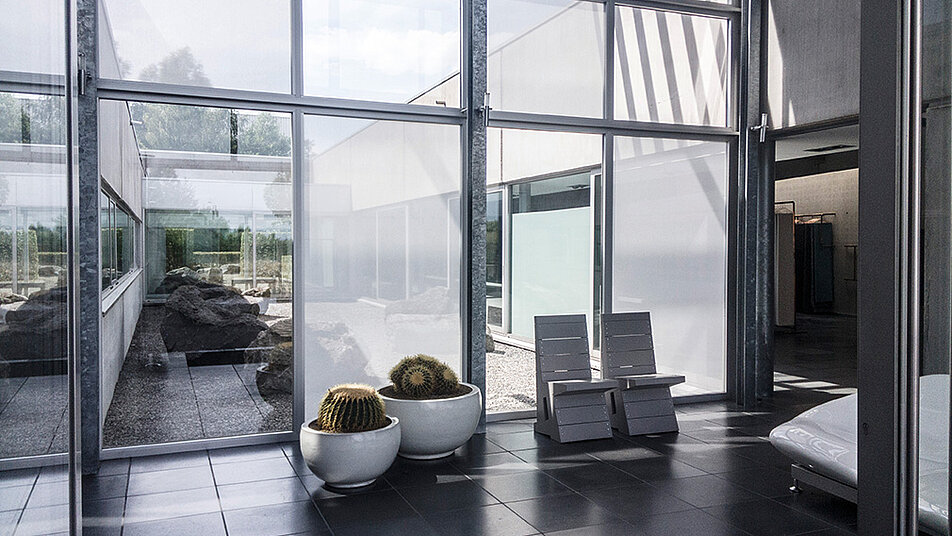 Die selbstklebende textile Fensterfolie Hafttextil SQUID®, auch Sichtschutzfolie genannt, schützt Ihre Innenräume vor neugierigen Blicken von draußen und lässt gleichzeitig Tageslicht in Ihre Räume. Egal ob Fensterflächen oder Glastüren, auch Ihre Glasflächen sind durch das Hafttextil SQUID® geschützt. Das Hafttextil hat einen ähnlichen Effekt wie eine Milchglasfolie oder ein Fenster aus Milchglas. Die individuell zugeschnittene, selbstklebende textile Fensterfolie eignet sich hervorragend für private Räume wie Badezimmer, Küche oder Schlafzimmer, aber auch für gewerbliche Räume. Die textile, lichtdurchlässige Sichtschutzfolie SQUID® gibt es in sechs stilvollen Farbnuancen von Weiß über Beige und Grau bis hin zu Schwarz. In der Farbe Chalk (weiß) lässt sich das Hafttextil sogar mit allen Motiven der Design-Collection, über 200 RAL-Farben sowie mit individuellen Mustern und Motiven bedrucken.