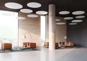 TERIO PLUS Deckenabsorber optimieren die Raumakustik großflächig und fügen sich dezent in die Raumgestaltung ein – oder setzen bewusst gestalterische Akzente. Besonders wirksam in Räumen mit hohen Decken und großen Volumina.