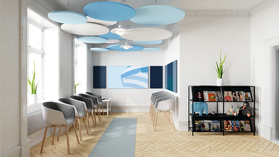 Erhältlich in drei Formen: rund, rechteckig oder quadratisch. Verschiedene Größen und Farben sowie Naturweiß bieten gestalterische Flexibilität. Die Absorber können mit einem Deckenabstand bis zu 1000 mm montiert werden, unterschiedliche Befestigungssysteme ermöglichen die Anpassung an bauliche Gegebenheiten.