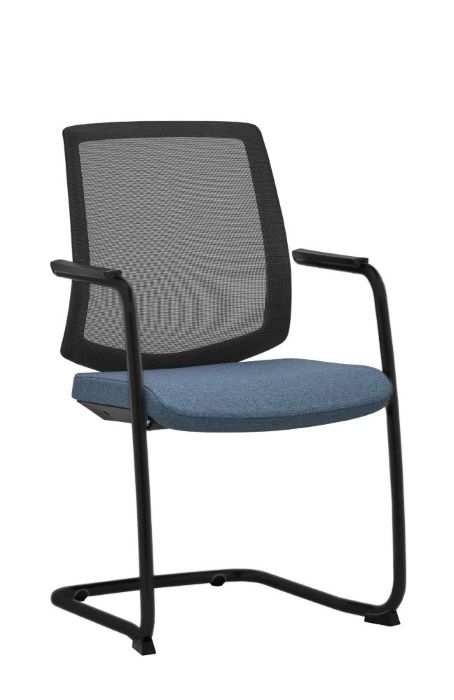 Stapelbarer Freischwinger Konferenzstuhl mit Armlehnen, Sitzfläche und Rückenlehne sind getrennt. Rückenlehne mit Netz.