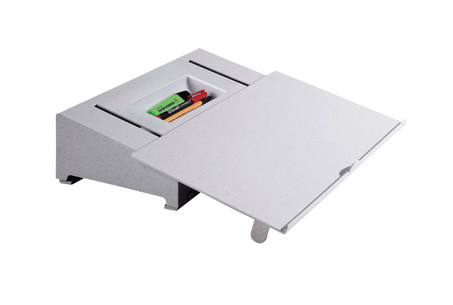 Die Schreib- und Lesevorlagen liegen direkt zwischen Tastatur und Monitor. Sie sitzen aufrecht, rückenschonend, ohne Verdrehungen und Nackenschmerzen. Ihre Blickrichtung wechselt zwischen Monitor und dem Dokument. Die Augen sind entspannt. Kein Zeitverlust mehr durch dezentrale Blickwechsel. Leistungsfähigkeit und Konzentration steigen.